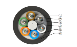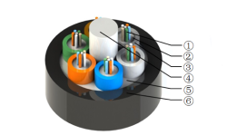 1 光纖、 2 纖膏、 3 松套管、 4 FRP、 5 阻水纜膏、 6 PE外護套