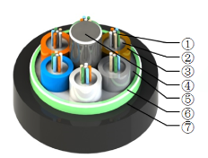 1 光纖、2 纖膏、3 松套管、4 鋼絲加強件、5 阻水纜膏、6 雙面涂塑皺紋鋼帶、 7 LSZH外護套