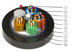 1 光纖、 2 纖膏、 3 松套管、 4 鋼絲加強件、5 填充繩(可能有)、 6 撕裂繩(可能有)、7 阻水纜膏、 8 銅導線、 9 雙面涂塑鋁帶、 10 PE外護套