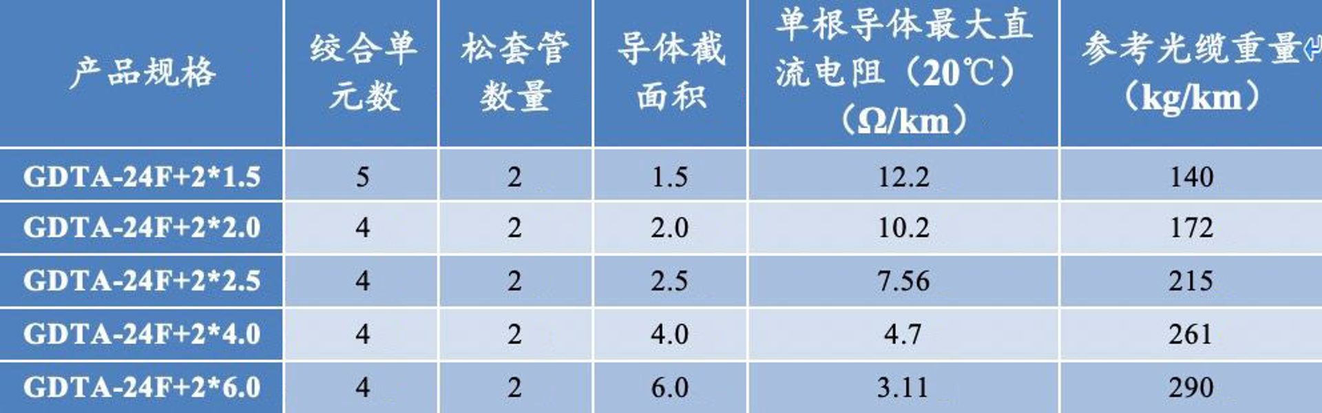 注:1. 表中參數為GDTA(S)典型結構參數,我司可提供2~48芯任意規格或特殊結構參數的GDTA(S)光纜。